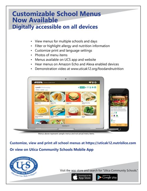 Customize, view and print all school menus by clicking here or visiting https://uticak12.nutrislice.com