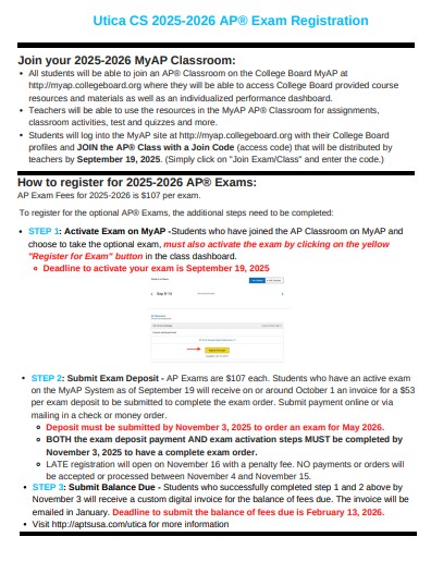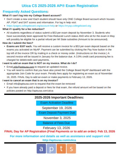 Students who have an active exam on the MyAP System as of September 18th will receive an invoice via email from APTS. An invoice will be emailed to the parent email address associated with the student's College Board account. This invoice will be coming from APTS. A $53 deposit must be paid November 3, 2025. The remaining balance is due by February 13, 2026.
