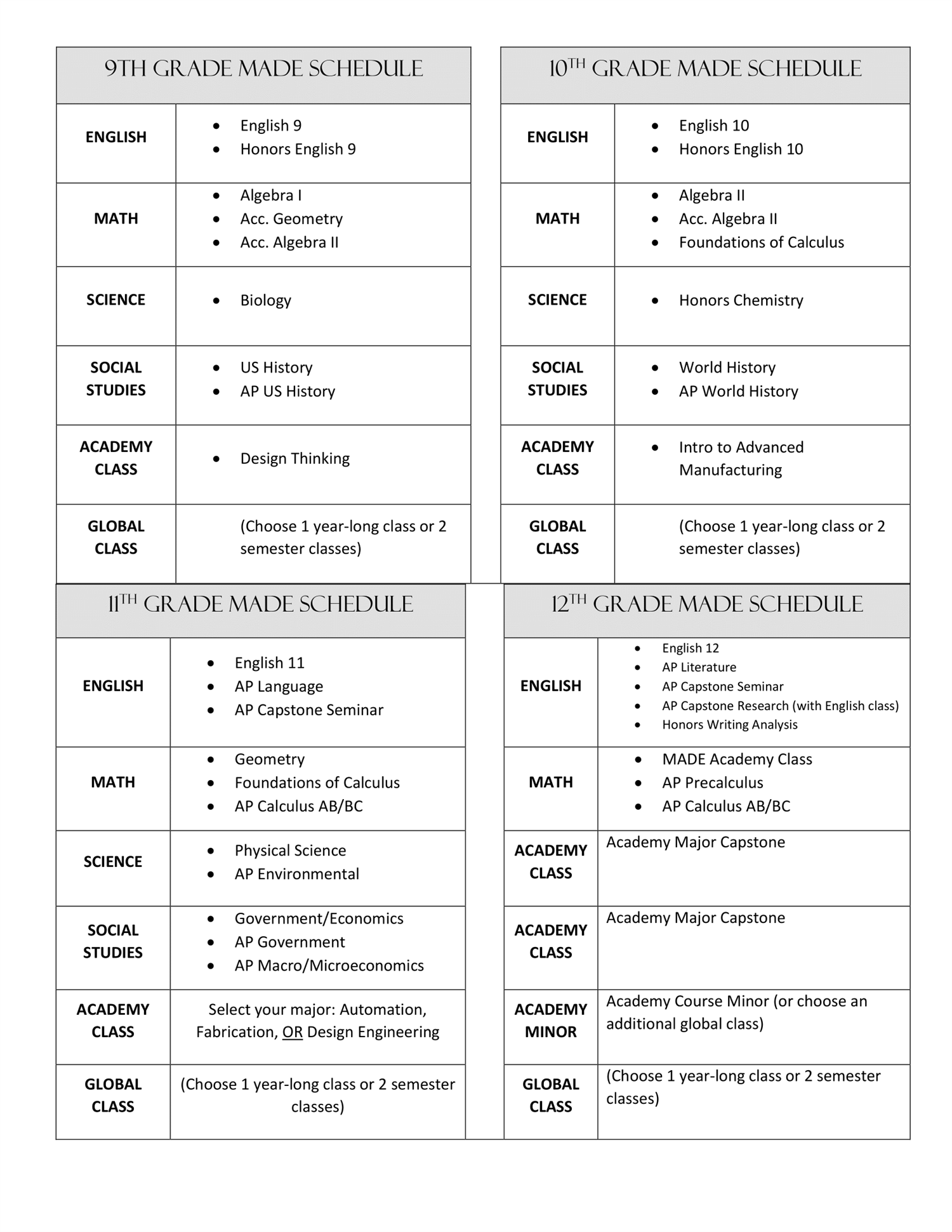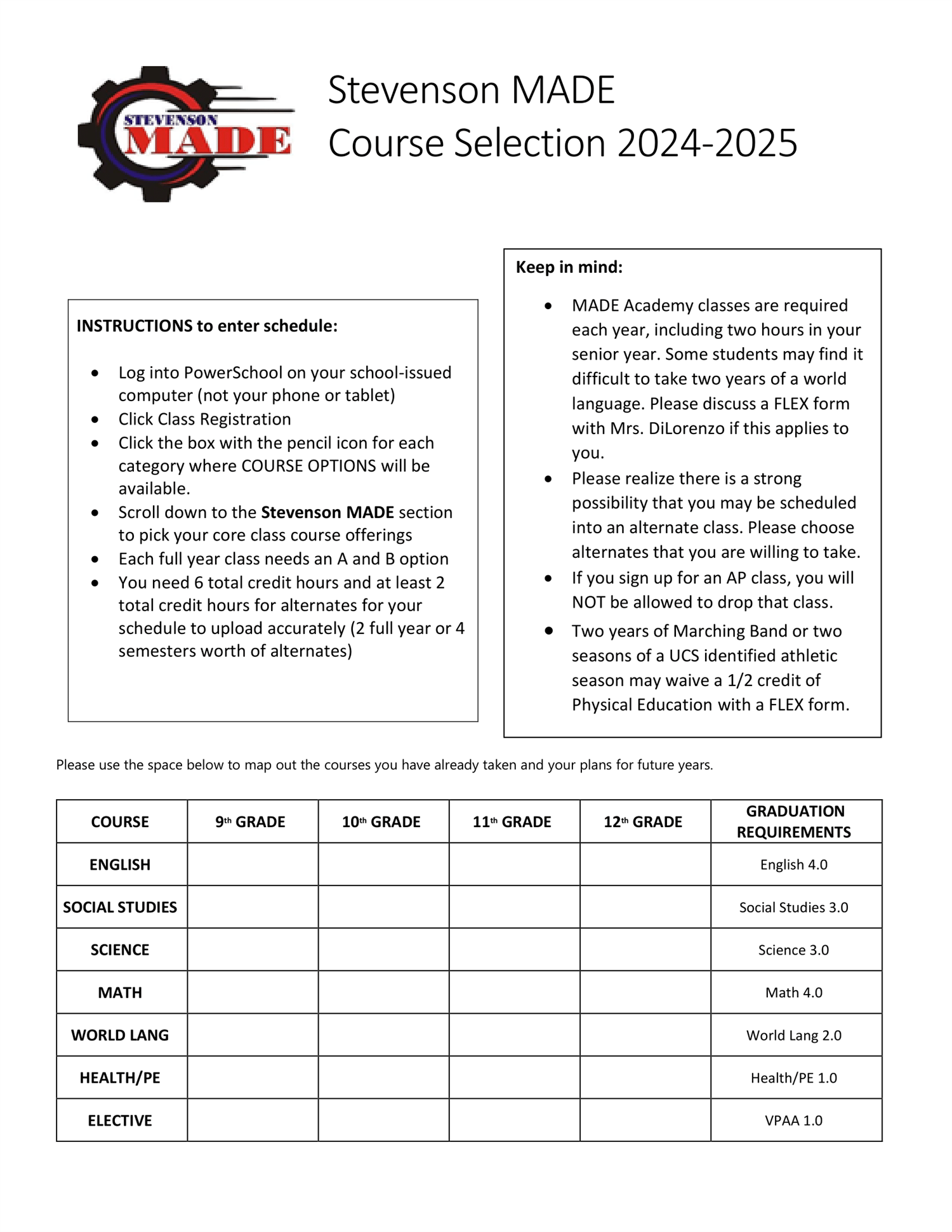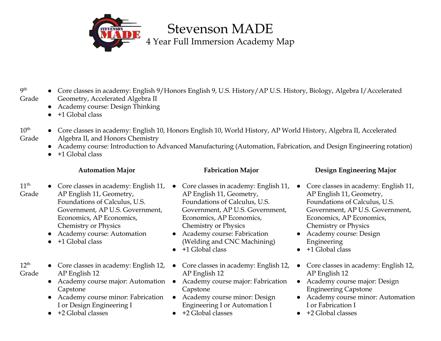 This page contains an overview of the Stevenson MADE curriculum and immersion map for a 4 year student.
